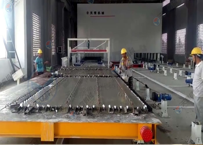 PC環(huán)形疊合板/內(nèi)墻板生產(chǎn)線的主要設(shè)備包括雙梁橋式起重機(jī)、清理機(jī)、脫模劑噴涂機(jī)、布料機(jī)、振動(dòng)臺、趕平機(jī)、拉毛裝置、預(yù)養(yǎng)窯、抹光機(jī)、碼垛車、養(yǎng)護(hù)窯、翻轉(zhuǎn)機(jī)、擺渡車、支撐滾輪、驅(qū)動(dòng)輪、模臺和成品運(yùn)輸車等。